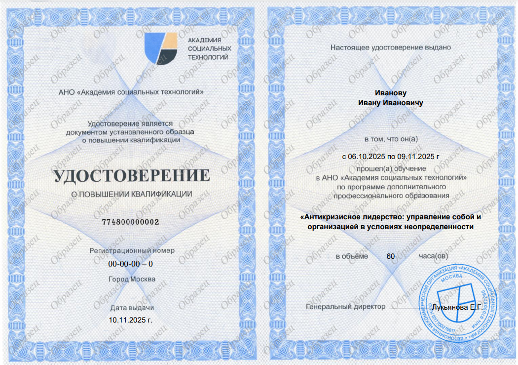 На курсе вы научитесь управлять собой, людьми и процессами в условиях неопределенности. Освоите инструменты стрессоустойчивости, адаптивности и антикризисного управления. Разработаете план действий для своей организации и станете уверенным лидером в нестабильной среде.