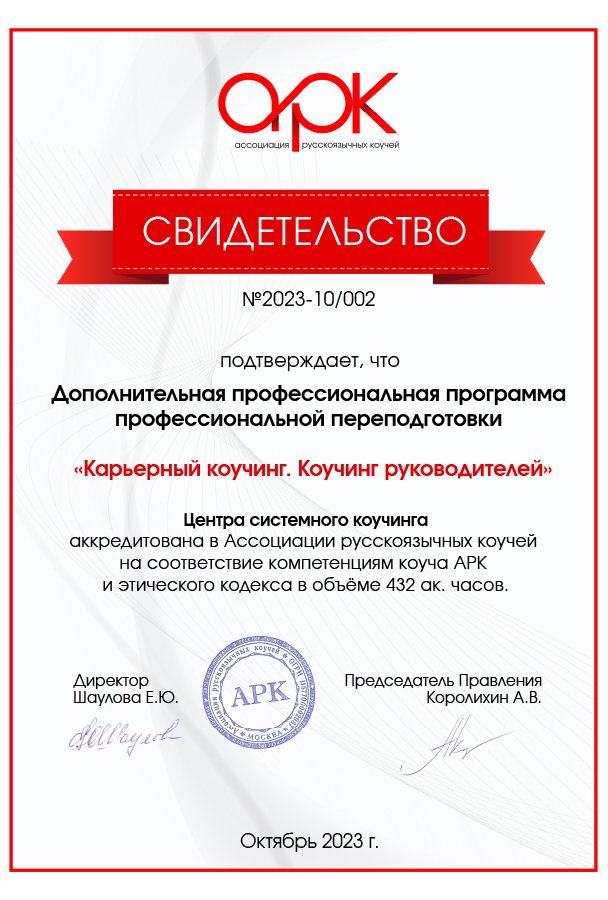 Программа "Карьерный коучинг. Коучинг руководителей" Центра системного коучинга — это системный образовательный курс, ориентированный на подготовку профессионалов, которые не только овладеют методами карьерного коучинга для бизнеса и лидеров, но и смогут разработать стратегию личной и организационной трансформации для руководителей и компаний. Государственная образовательная лицензия №Л035-01271-78/00679074 от 14.09.2023 г. Аккредитация проограммы в Ассоциации русскоязычных коучей № 2023-10/002.