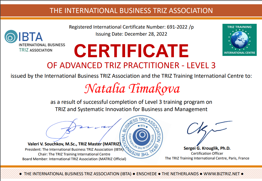 • Практик Бизнес-ТРИЗ (международная сертификация IBTA, 3 уровень). Опыт применения ТРИЗ для решения бизнес задач в различных сферах - 4 года