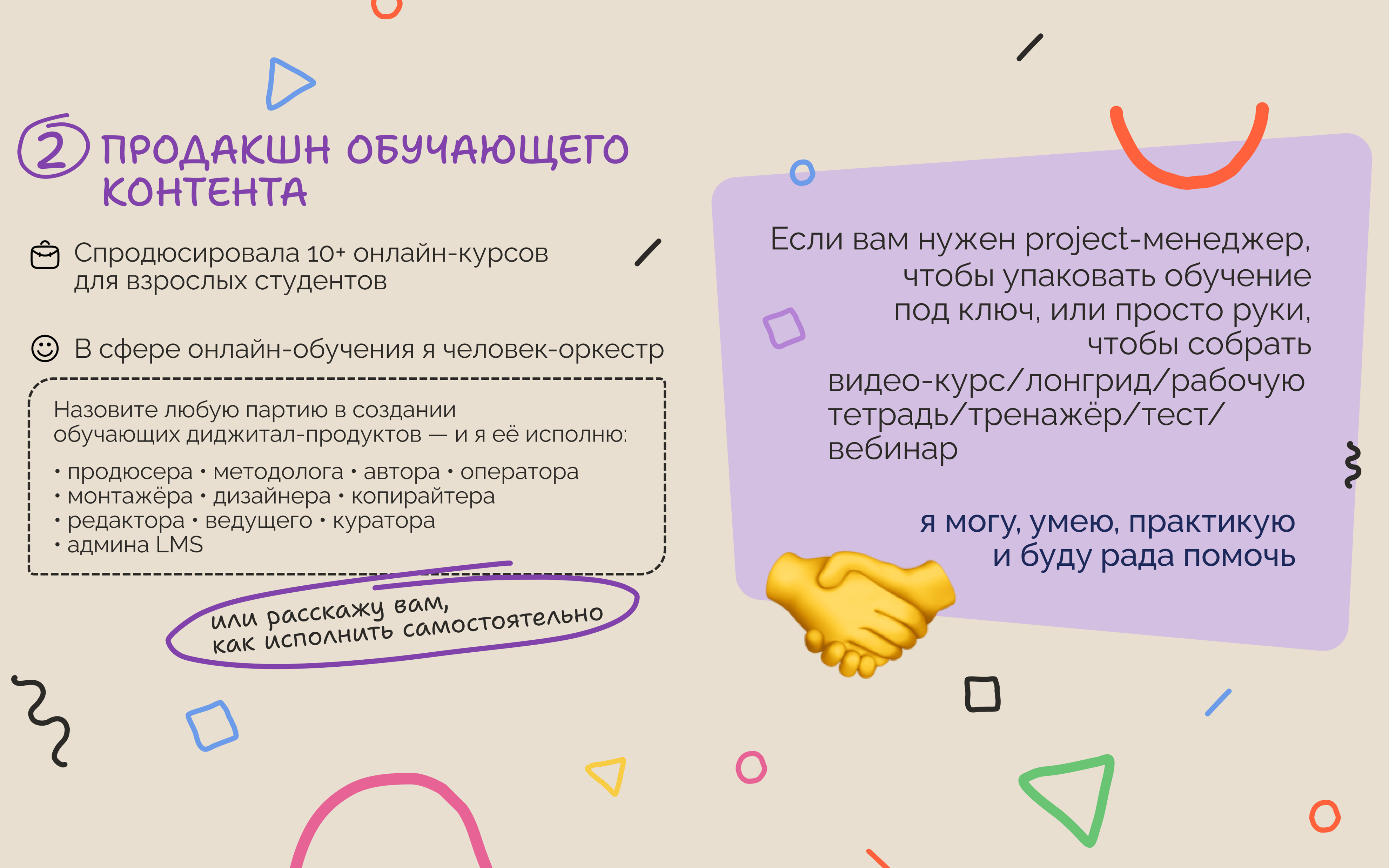 Сегодня сотрудничаю с компаниями и экспертами, которым нужна помощь в создании образовательных продуктов. Чем я могу быть полезна: