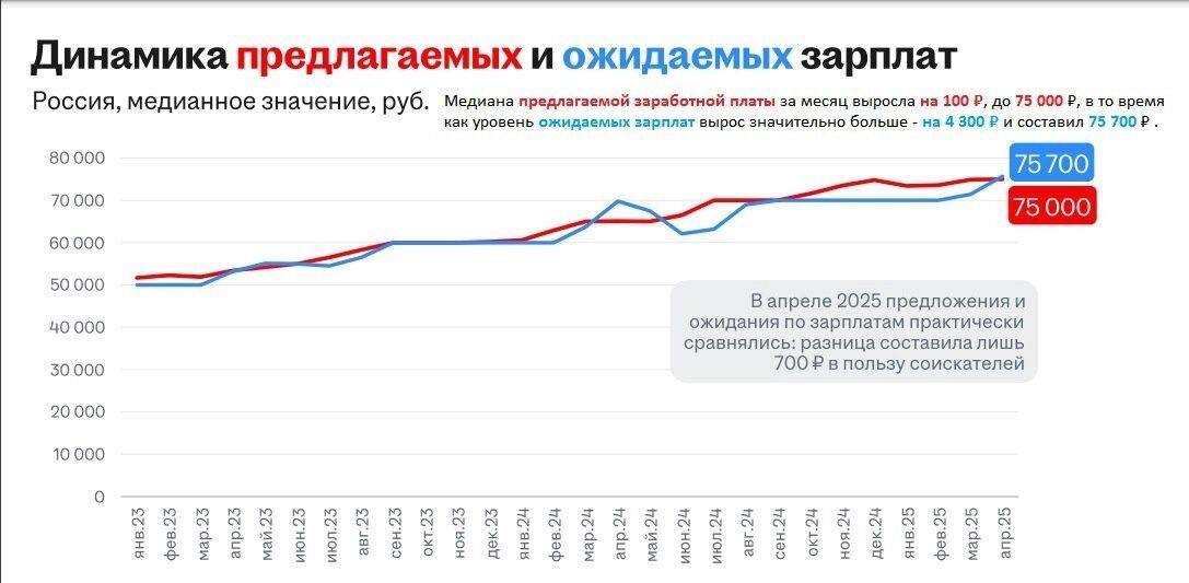 Зарплатные ожидания россиян по итогам апреля выросли на 6%, до 75 700 рублей, но получить желаемое проблематично: медианные предложения работодателей замерли. Что это значит для рынка труда, «НИ» рассказали эксперты.