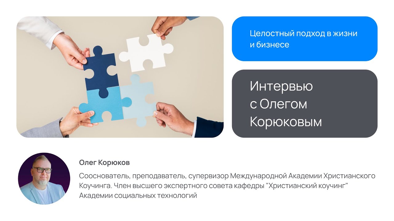 В серии интервью членов ВЭС Кафедры Христианский коучинг исследуем практическую ценность целостного подхода в работе с клиентами в жизни и бизнесе. Перед вами первое интервью серии, с Олегом Корюковым, сооснователем, преподавателем, супервизором Международной Академии Христианского Коучинга, членом высшего экспертного совета кафедры "Христианский коучинг" Академии социальных технологий.