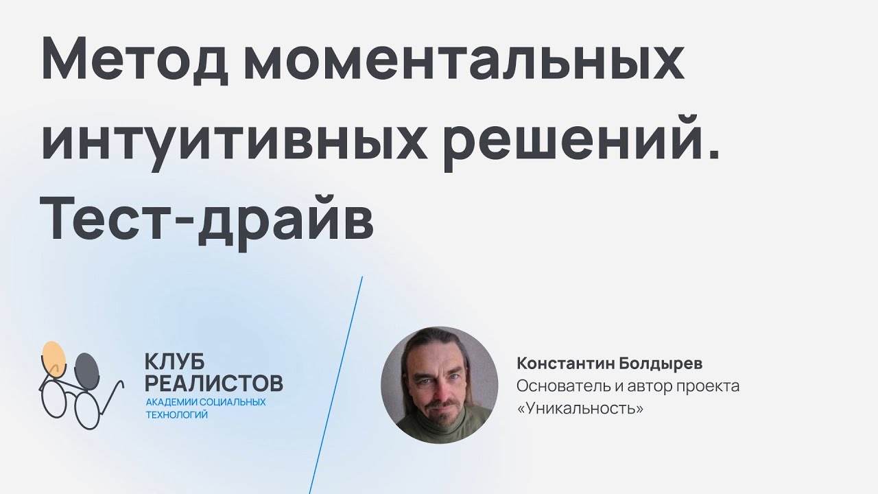 Константин Болдырев , психолог, эксперт кафедры «Ментальные практики», провел на площадке Клуба тест-драйв разработанного им «Метода моментальных интуитивных решений (Bio-feedback decision making system)». Это увлекательный перформанс, не оставляющий ни одного участника равнодушным, к тому же дающий прагматический результат: решение личной, нерешаемой ранее, задачи. В ролике вы увидите реальное применение метода в работе с двумя протагонистами.
