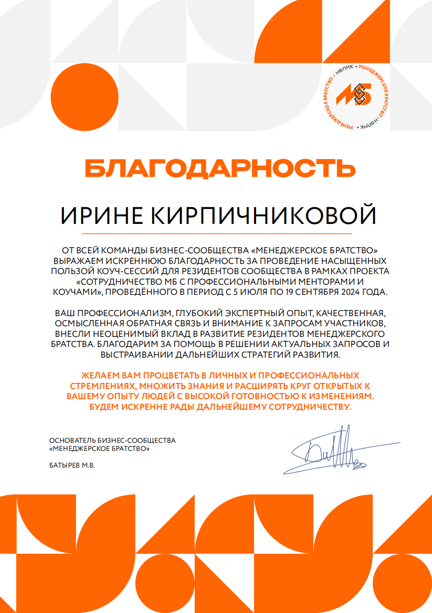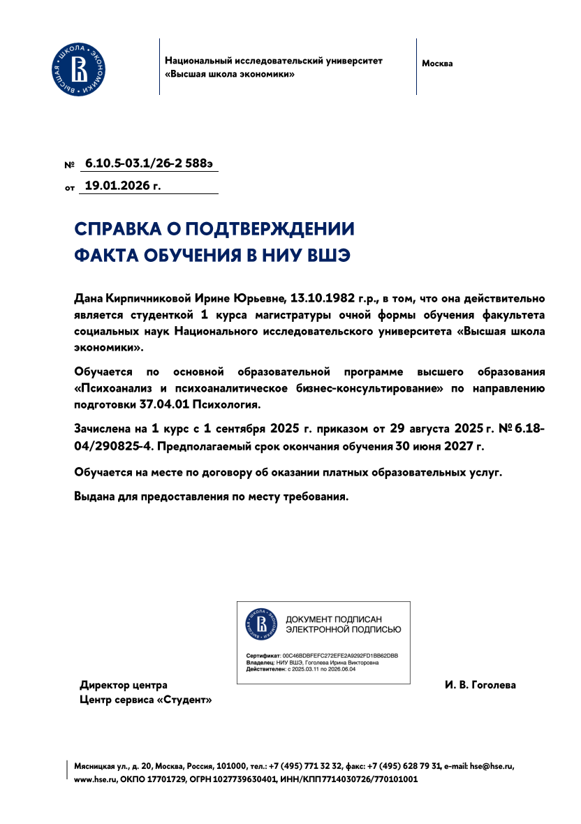 Коучинг проводится по международным стандартам (ICF) с применением методов психоаналитического бизнес-консультирования (НИУ ВШЭ).