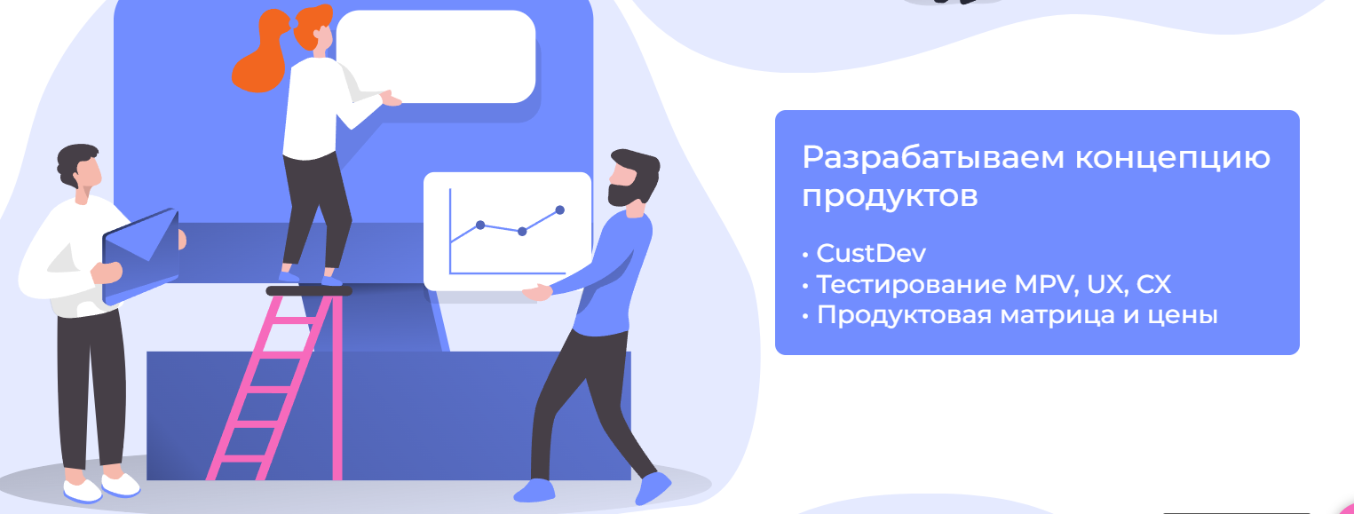 Для каждого заказчика готовим индивидуальный план исследования, проводим установочную сессию с командой, составляем гайд интервью или фокус-групп, анализируем и презентуем команде, помогаем с генерацией идей по развитию продукта с опорой на полученные данные.