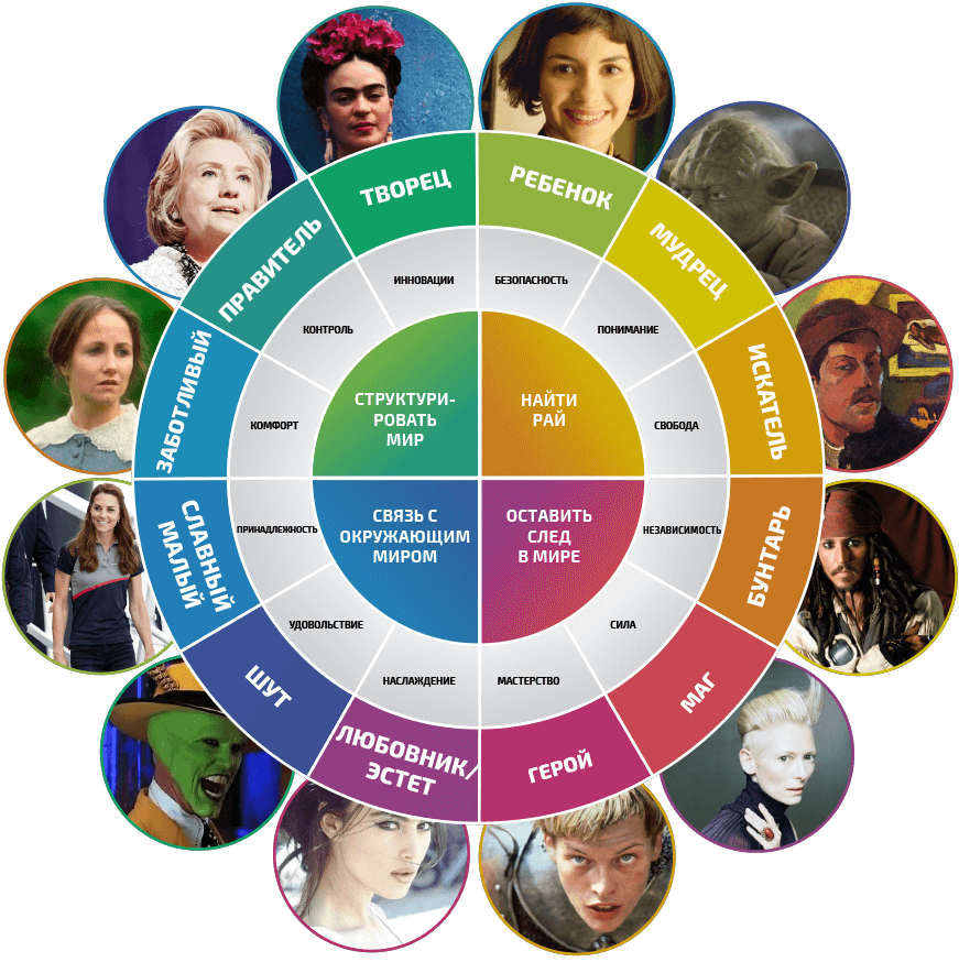 - Описание архетипов по Маргарет Марк и Кэрол Пирсон (Герой. Правитель. Мудрец. Исследователь. Творец. Бунтарь. Заботливый. Простодушный. Шут. Любовник. Маг. Сирота).